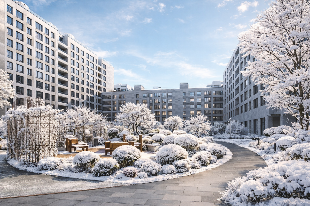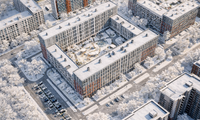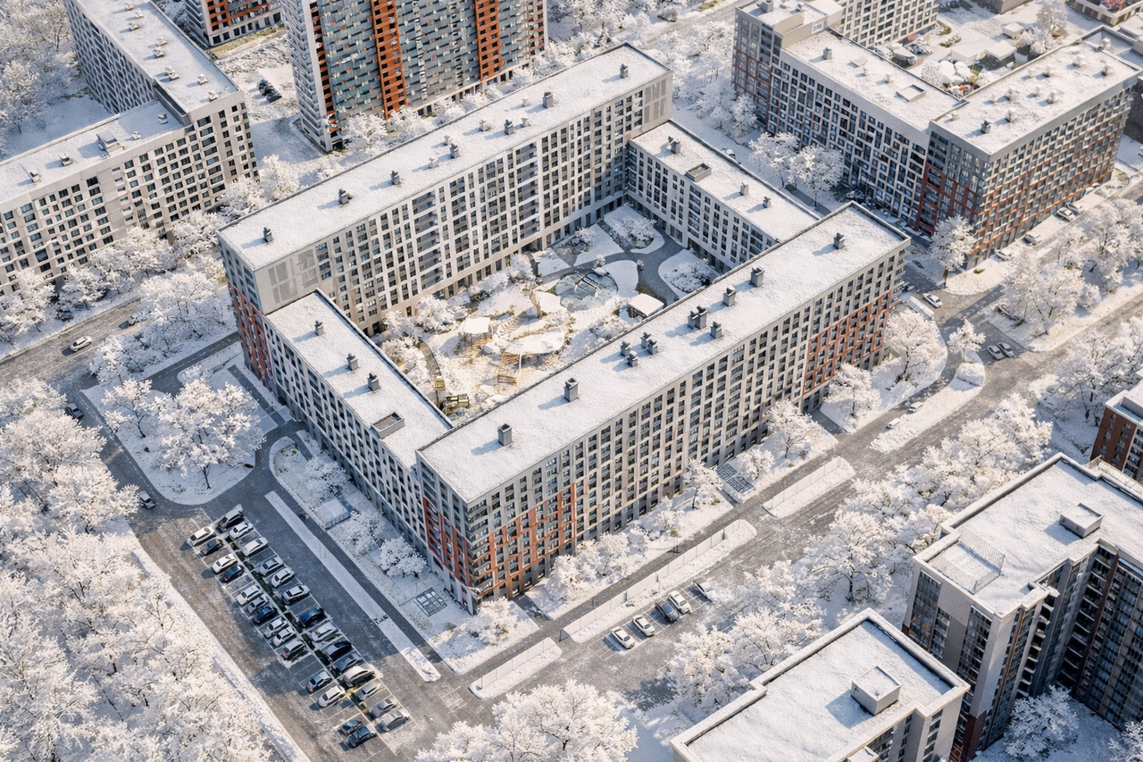 Современная минималистичная архитектура жилого комплекса органично вписана в городской ландшафт. Средняя высотность зданий сохраняет психологический комфорт, а большие площади остекления заботятся об инсоляции.